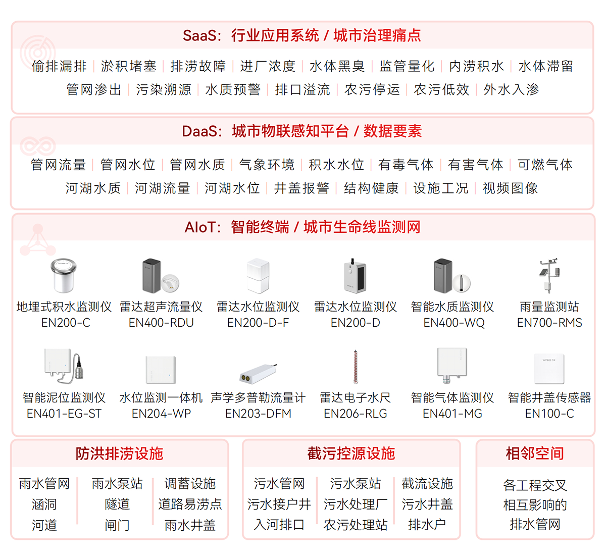對排水設施(雨污水管網(wǎng)、窨井蓋、截流泵站、提升泵站、抽水泵站、農(nóng)村污水處理站、溢流井、排水井、污水處理廠、調蓄設施等)關鍵節(jié)點、易澇積水點,河湖水位、流速,管網(wǎng)液位、流速、水質,內澇積水等指標進行實時數(shù)據(jù)監(jiān)測,形成設施完整、拓撲清晰、位置準確的排水設施“一張圖”,為排水空間規(guī)劃、設計、排水設施改造提供決策支持。