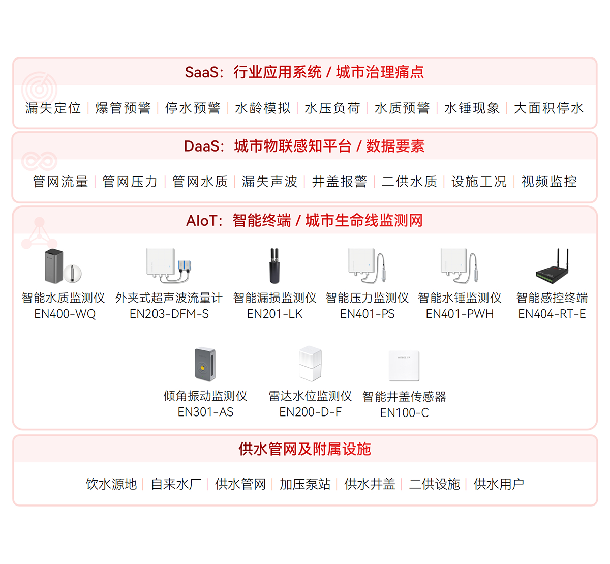 對供水管網(wǎng)設施及水質提供實時監(jiān)測,通過各類智能監(jiān)測終端保障供水壓力平衡、流量穩(wěn)定和供水安全,及時發(fā)現(xiàn)爆管并預警,避免大面積城市停水事故發(fā)生,為管網(wǎng)爆管預警分析、用水趨勢分析和泄漏量預警分析提供數(shù)據(jù)支撐。